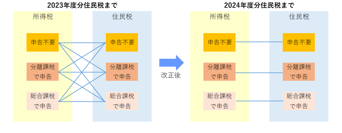 2024年度分住民税(令和5年度分確定申告)から、上場株式の配当等の申告方式が、所得税・住民税で別々の方式を選択できなくなります。